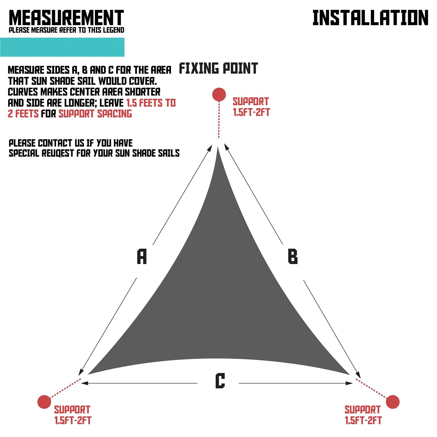 - Installation: Leave 1.5- 2 foot space for the hardware kit (Not included) between shade sail A ring and mounting points. Note: The fabric is stretchy. The title‘s sizes are for when it's stretched tight. Be sure to fully extend the sail when installing it, or it'll be too small. You could also pick a slightly bigger size