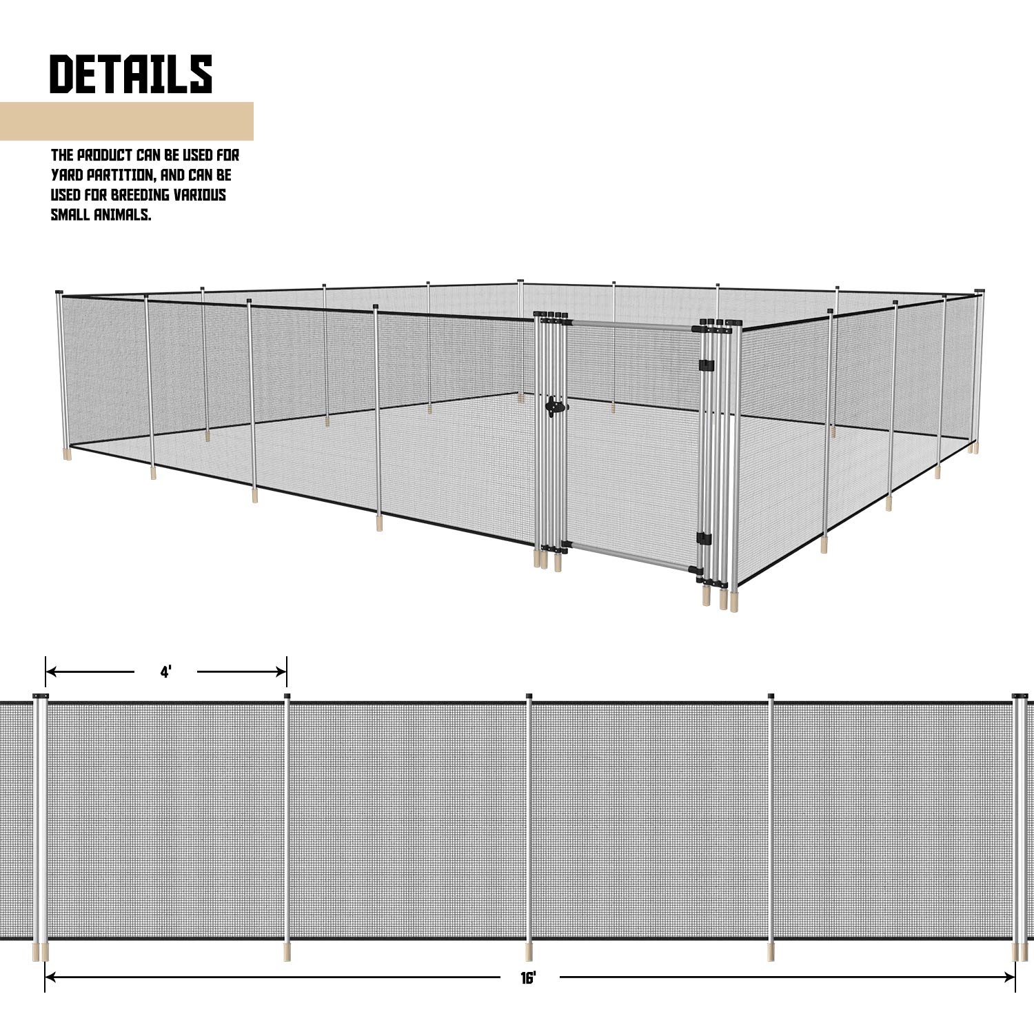 - Fence section each measures 16 feet long, 6 feet tall with 5 poles attached. Pole space: 4 feet. You can buy multiple sections based on your actual installation needs.