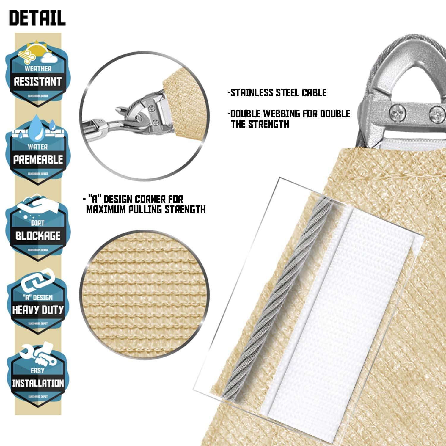 - Easy Installation Tips: When installing, leave 1.5 - 2 feet of space for the hardware kit (not included) between the sail's A ring and mounting points. As the fabric is stretchy, ensure full extension during installation, or opt for a slightly larger size