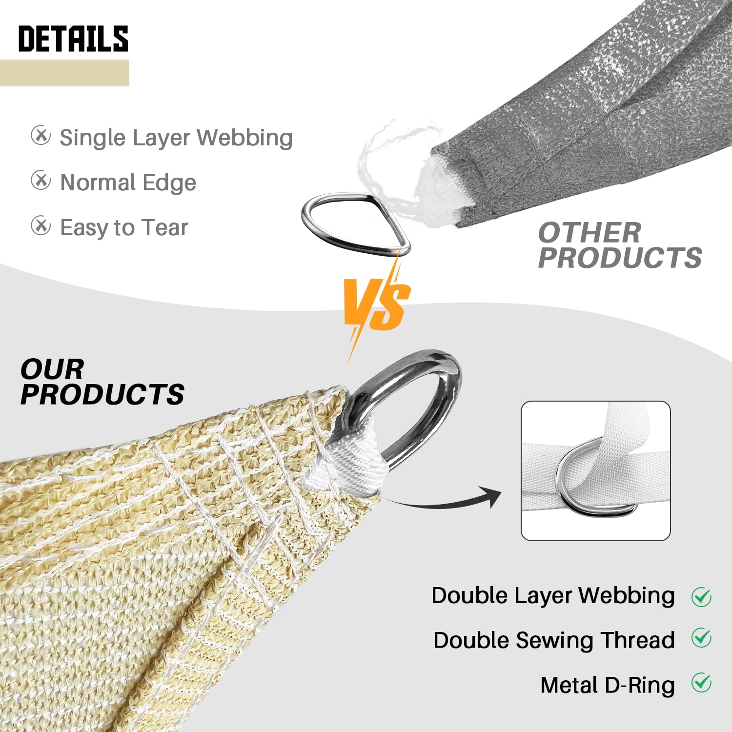 - STRUCTURE DESIGNED FOR DURABILITY: The 20 ft PE rope and durable D-ring make it easy to attach the shade sail to any sturdy place, providing sun protection where it's needed. Heavy-duty, double-wrap design prevents abrasion to help the D-ring attach securely to the shade sail.