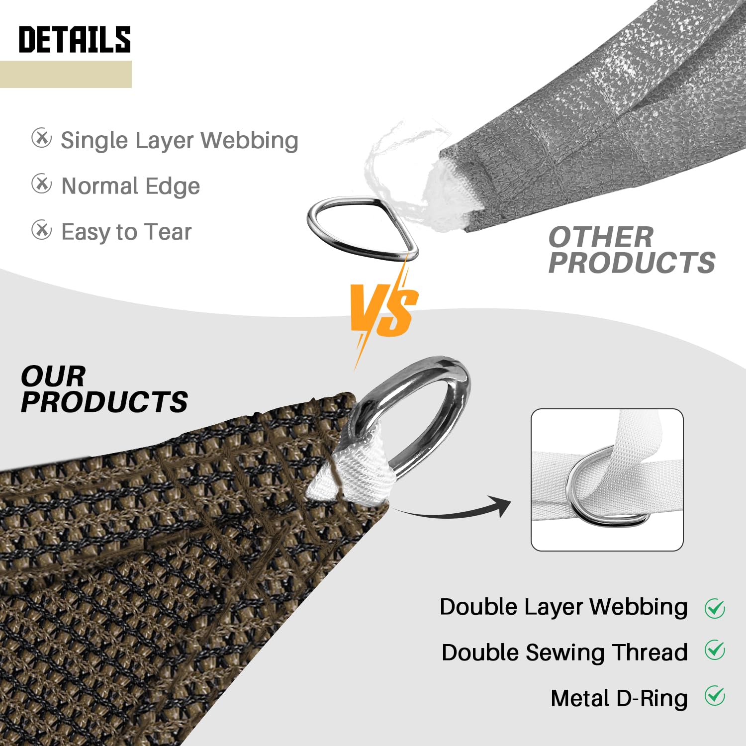 - ATTENTION: Our shade sails have curved sides to enhance pull strength and prevent drooping; this can add 1"-8" to the side length. The middle center of the sail will be shorter in width due to curves. We support custom size service, if you need a straight edge, or receive a product with quality issues please contact us.