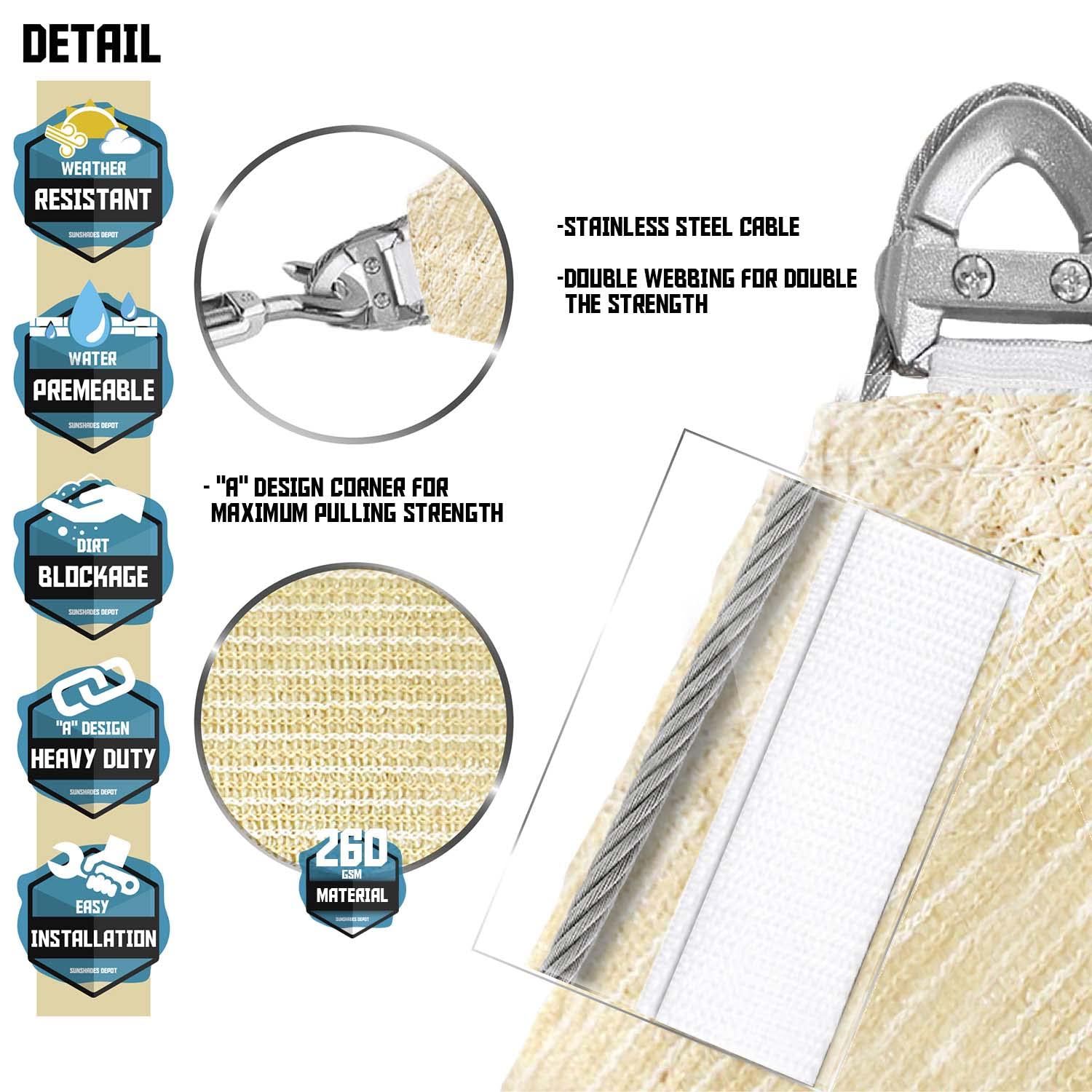 - SUPER HEAVY DUTY NEW PATENT DESIGN: Made of 260 GSM permeable extra heavy-duty fabric, heavy-duty mounting rings, cable wires built-in edges, integrated into the mounting rings. All pulling strength goes to the cable wires, not only making the edges more durable. It also enhances the appearance of shade sail.